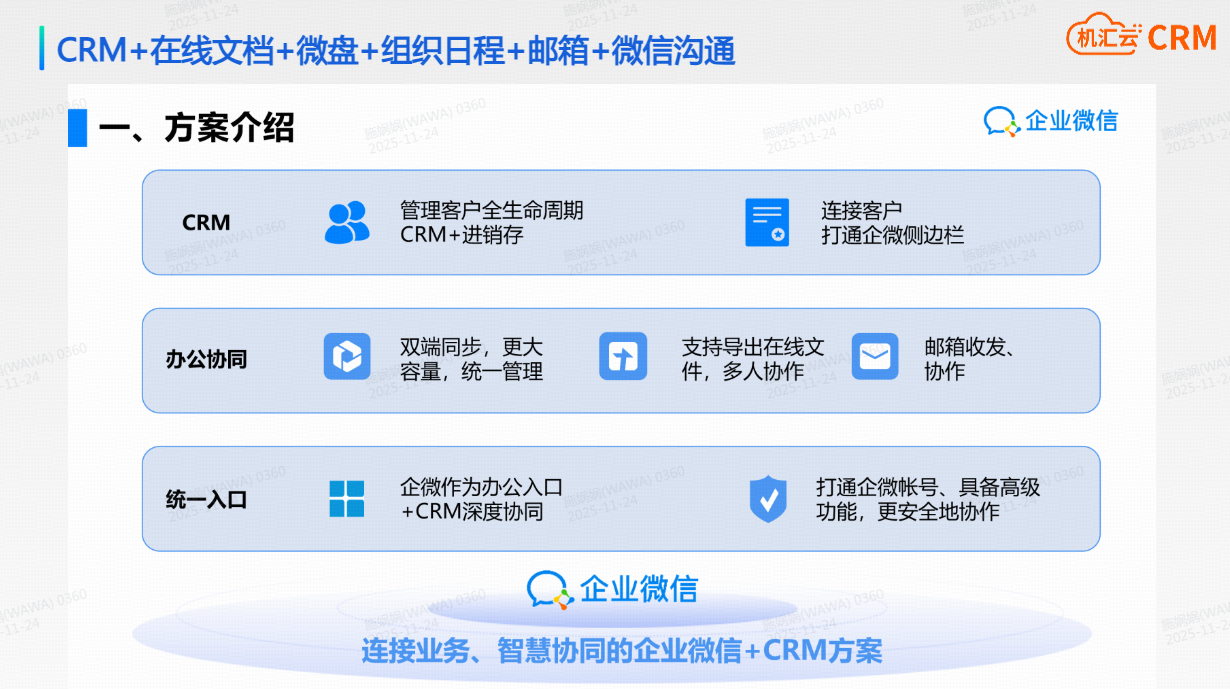强大的协同与移动办公:无缝集成企业微信、钉钉等平台,实现跨部门任务协作、日程协调、信息同步,支持随时随地办公。同时,机汇云能够通过灵活的接口开发与配置,与企业现有的主流ERP等系统进行打通。