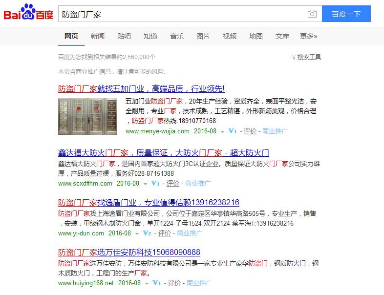 如:每天在百度搜索【防盗门】的有1656个人。然后也有一些防盗门厂家用这个关键词做了付费推广。那么这里就要思考了,这1656个人中到底是消费者多,还是经销商多?消费者会不会也会搜索防盗门?我的目标客户一般会搜索什么词?所以就可以得出,消费者也有可能在百度里面搜索防盗门,这部分进来的就是无效流量。如果你的关键词选择的是【防盗门厂家】,那么搜索这个关键词的消费者就大大的减少,而防盗门经销商的人就增加了。